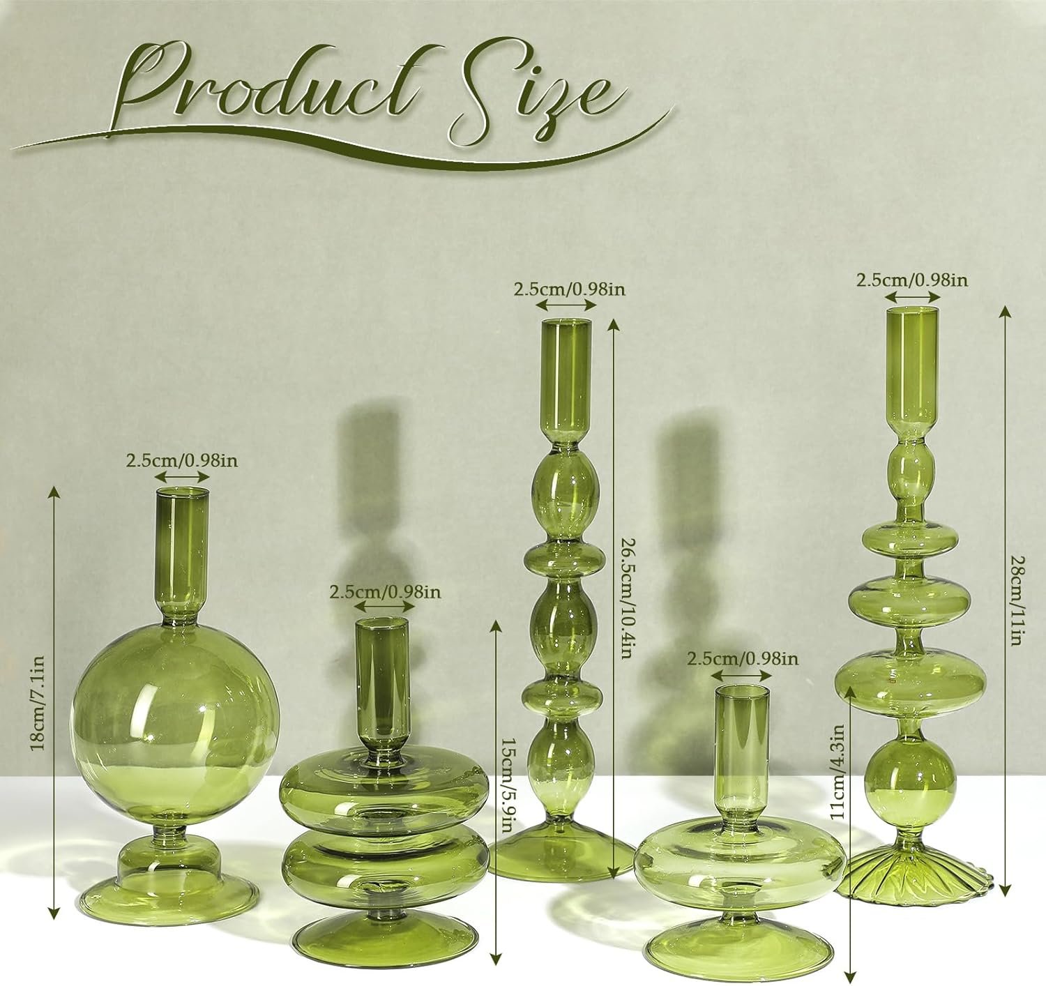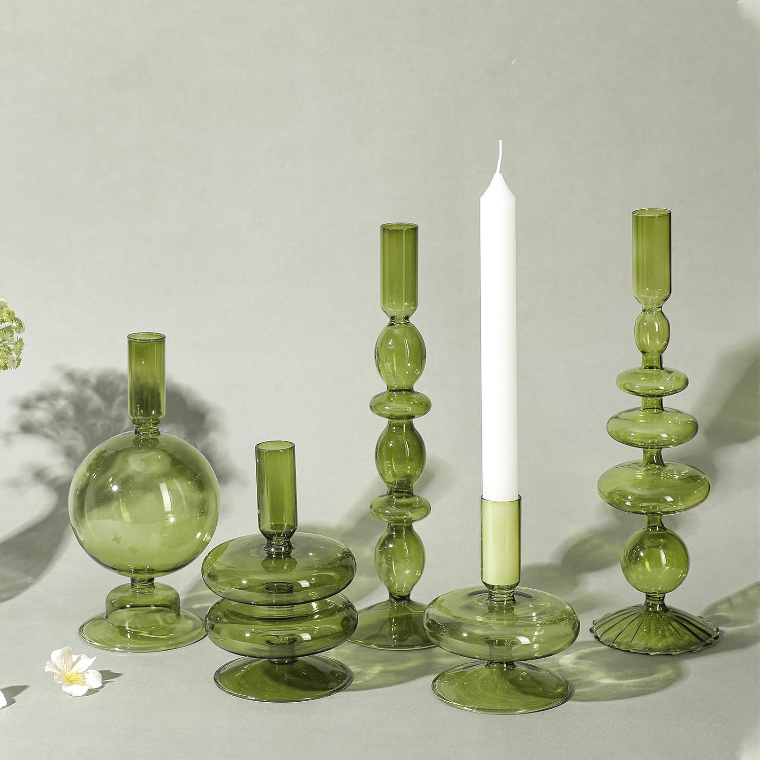 5 Pcs Glass Candlestick Holders Colorful Glass Taper Candle Stand Groovy Candlestick Wavy Boho Chic Clear Bases Holders Elegant Vase for Home Party Centerpiece(Green)