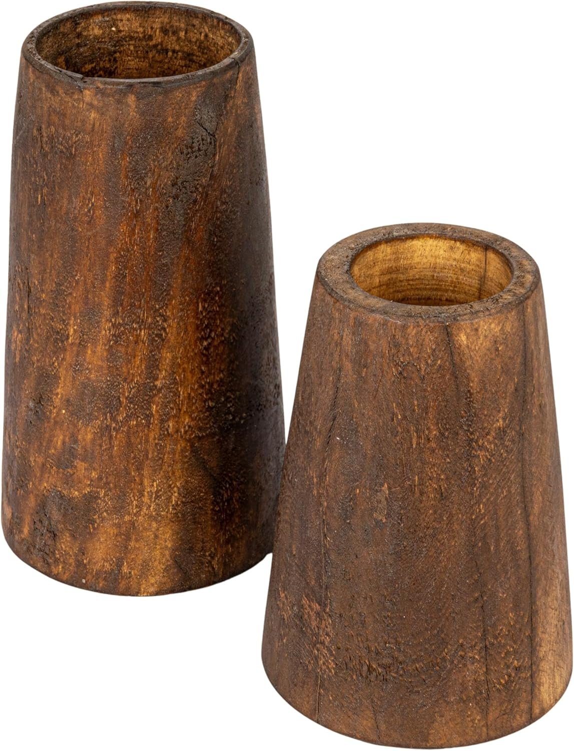 • A pair of rustic and charming wood vases that are made from found reclaimed wood and have a distressed finish that gives them a vintage and unique look