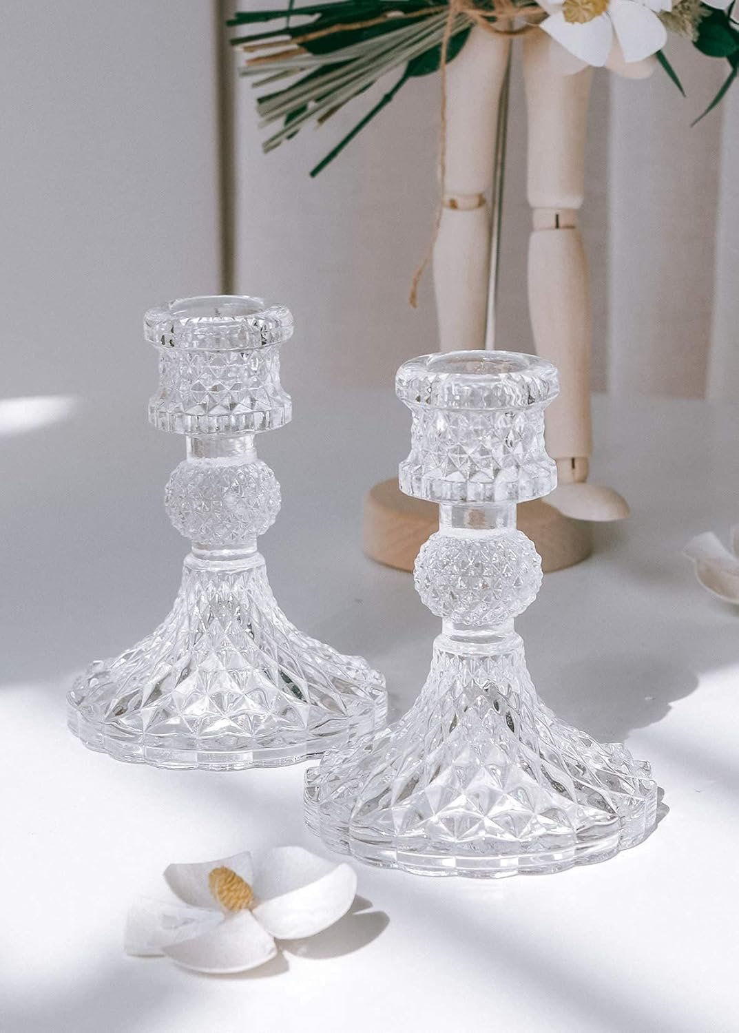 Taper Candle Holders Set of 2, Clear Glass Candlestick Holder Fit 0.8 Inch Candles, 4 Inch Tall Crystal Decorative Candle Stand Centerpiece for Table Wedding Dinning Party